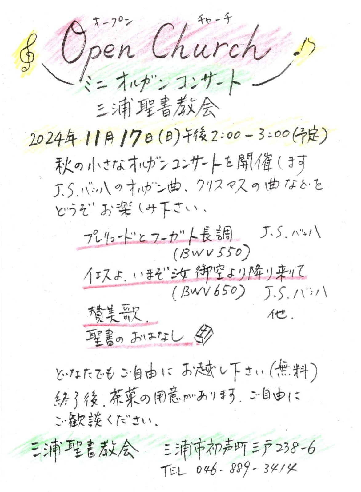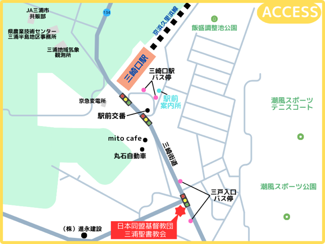 教会は、神奈川県三浦市、京急のどん詰まりの駅である三崎口駅から徒歩4分ほどのところにあります。神奈川県と言えば横浜や川崎を思い浮かべる方は、駅を降りるとびっくりするかもしれません。そこには畑や森、海まで見渡せる景色が広がっています。